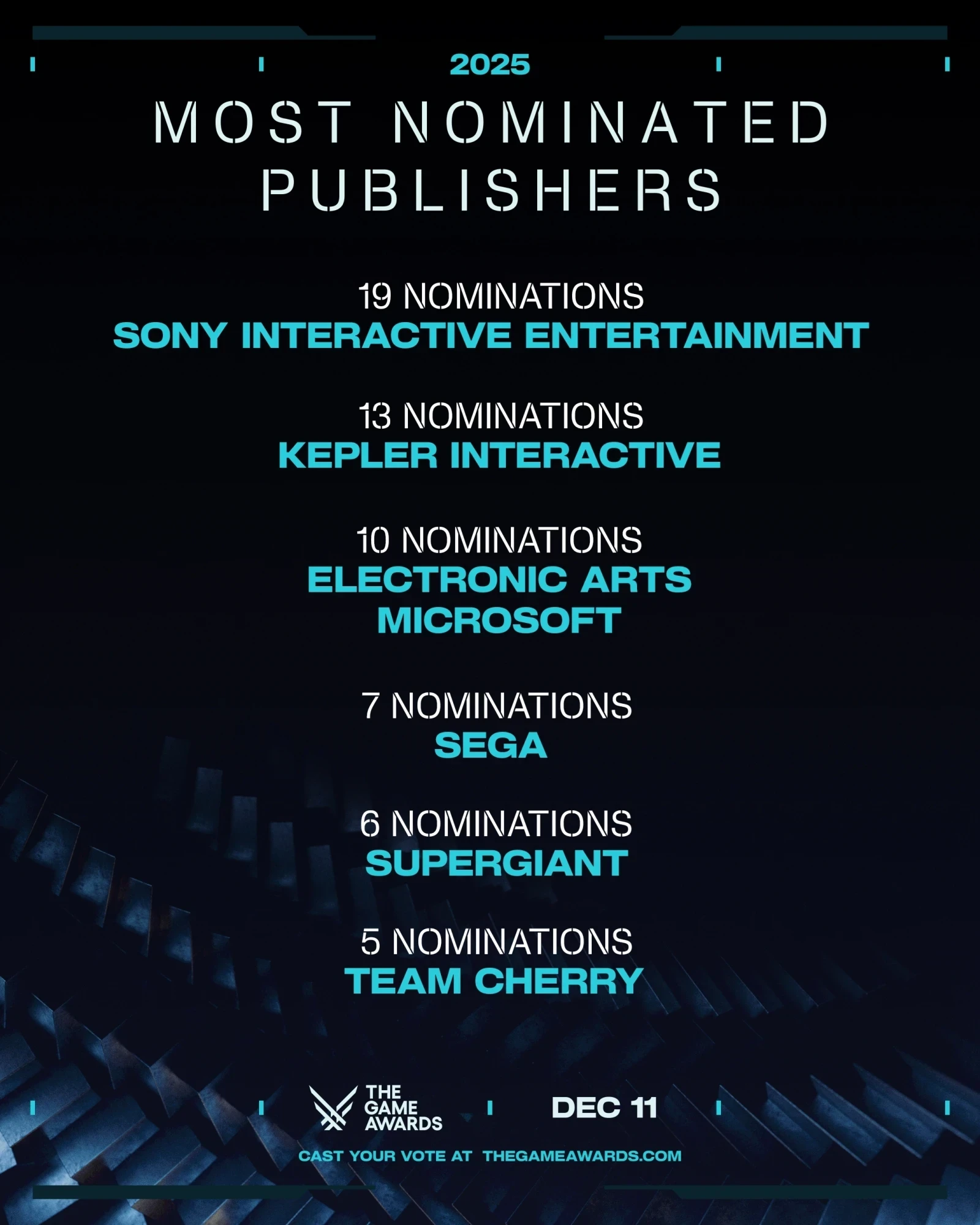 При этом чаще всего на The Game Awards 2025 номинировали следующих издателей: