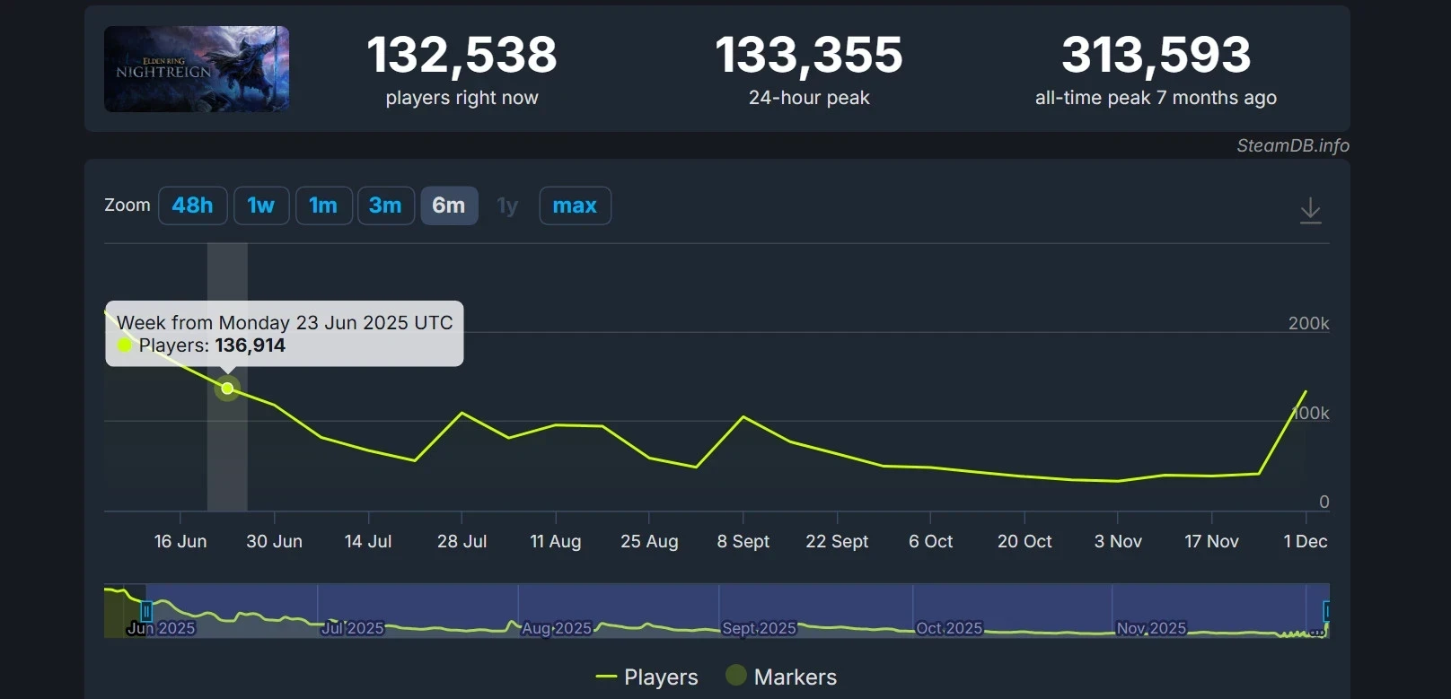 Рейтинг дополнения The Forsaken Hollows в Steam остаётся смешанным — у DLC лишь 46% положительных обзоров. Несмотря на критику, онлайн Elden Ring Nightreign резко взлетел и превысил 133 тысячи игроков за последние сутки. В последний раз аналогичные показатели наблюдались лишь в июне — тогда с момента релиза не прошло и месяца.