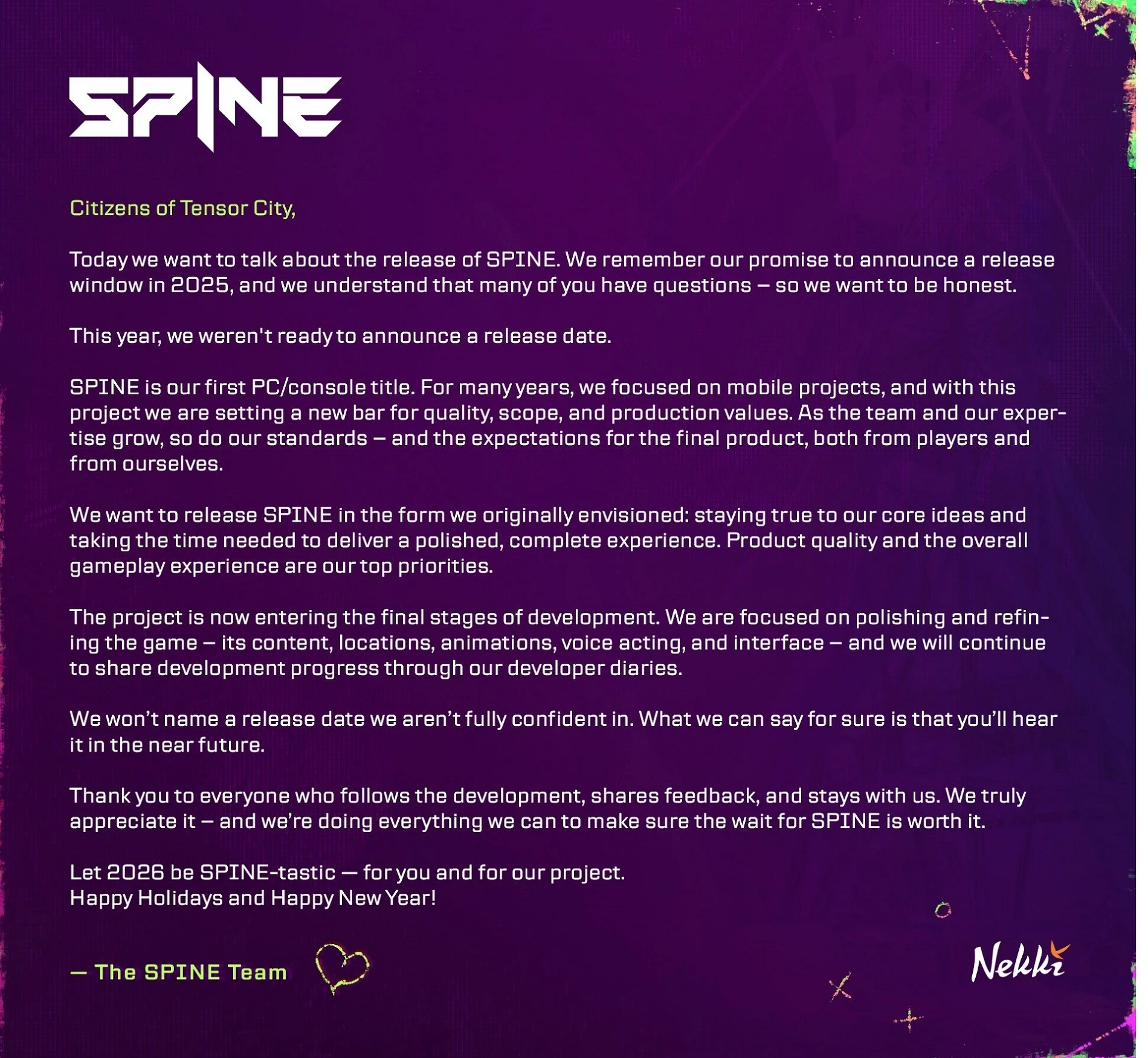 В настоящее время Spine переходит на завершающий этап разработки. Nekki займётся общей полировкой и обязательно поделится успехами с сообществом. А вот дату релиза должны назвать «в ближайшем будущем».