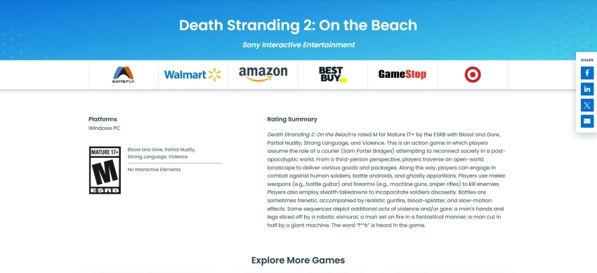 Обложка: скриншот Death Stranding 2: On the BeachВ сети обратили внимание на то, что агентство ESRB вновь выдало возрастной рейтинг Death Stranding 2: On the Beach на PC. Изначально страница компьютерной версии появилась в ноябре 2025 года, но уже спустя пару дней была удалена. Теперь же найти информацию о порте на сайте агентства можно вновь. Увы, без каких-либо новых деталей.