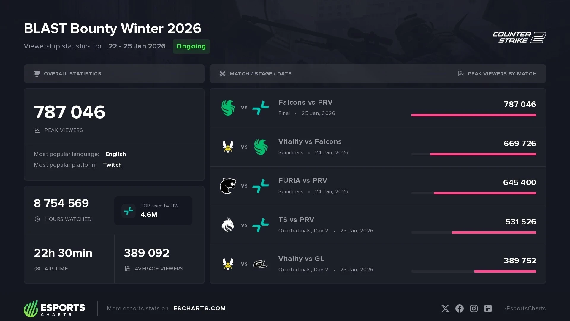 Источник: HLTVАналитический портал Esports Charts подвел статистические итоги турнира BLAST Bounty 2026 Season 1 по Counter-Strike 2. Чемпионат показал отличные результаты вовлеченности аудитории, а пик интереса пришелся на решающее противостояние.