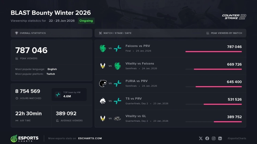 Гранд-финал BLAST Bounty Winter 2026 по СS2 собрал у экранов более 787 тысяч зрителей