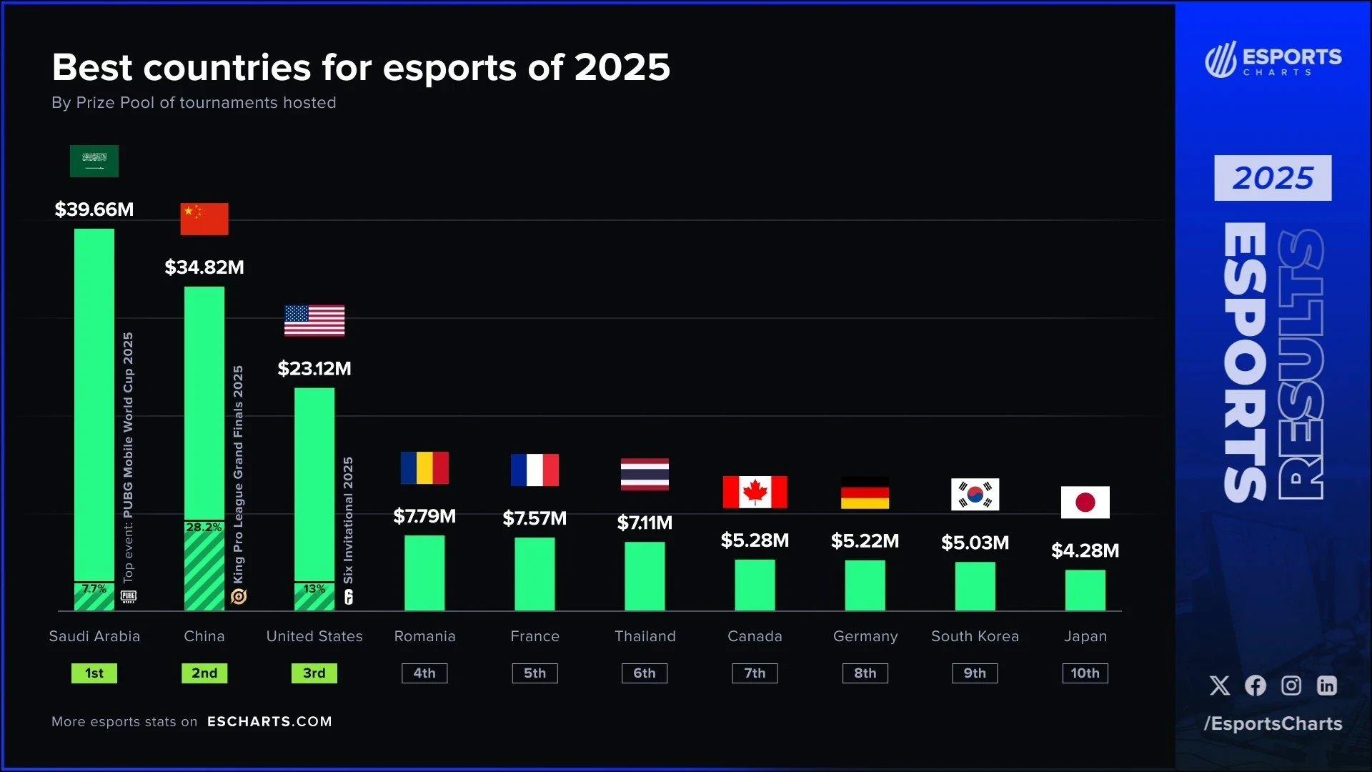 Источник: Esports ChartsРанее аналитический сервис Esports Charts представил итоговую статистику по распределению призовых фондов на турнирах за прошедший год. Главным итогом отчета стала смена глобального лидера: Саудовская Аравиязаняла первое место, инвестировав в индустрию рекордные суммы.