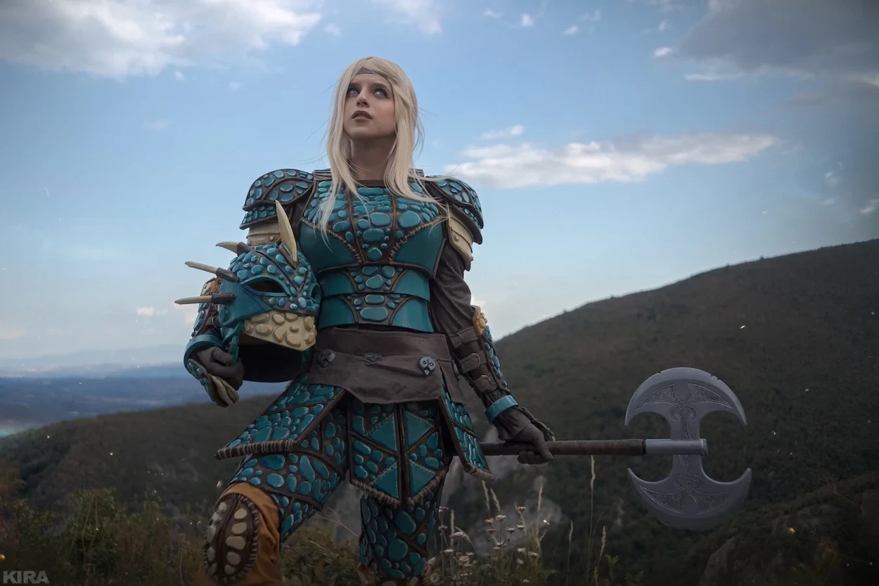 Модель показала беловолосую девушку, облаченную в доспехи, напоминающие броню ее дракона Громгильды, а в ее руках топор.