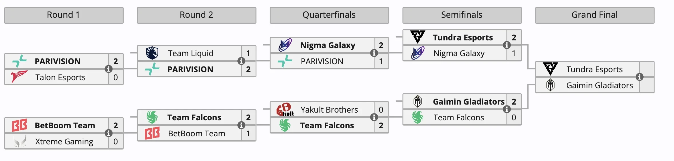 Накануне Tundra Esports2 обыграла Nigma Galaxy со счетом 2:1, а Gaimin Gladiators выбила из борьбы Team Falcons — счет 2:0. Проигравшие команды разделили 3-4 место и заработали по 60 тыс долларов.