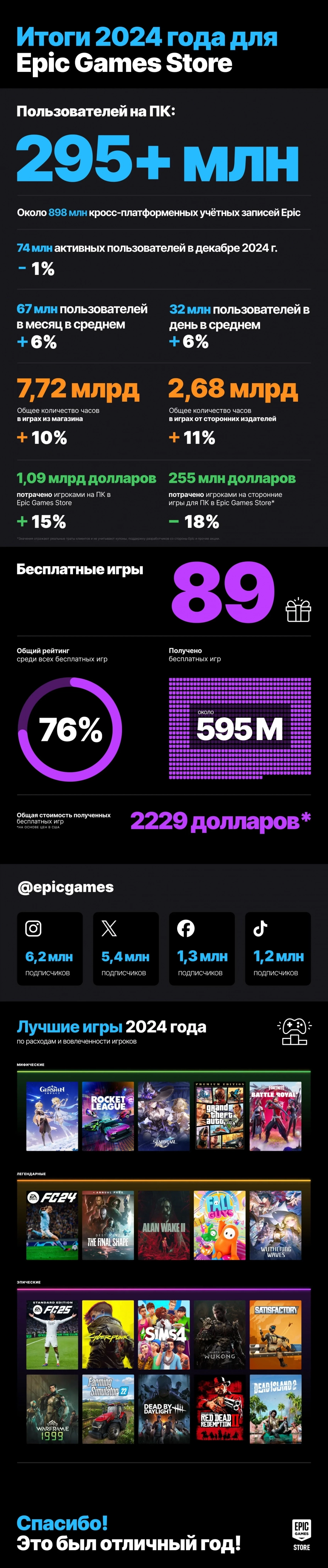 • Общее количество учётных записей Epic Games на всех платформах выросло до 898 миллионов, что на 94 миллиона больше, чем в 2023 году;
