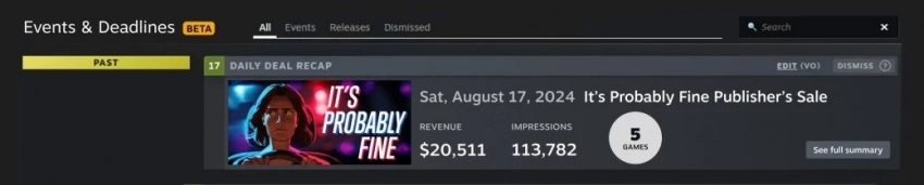 - итоги промоакции - отображаются сразу после окончания предложения дня на главной странице Steamworks;