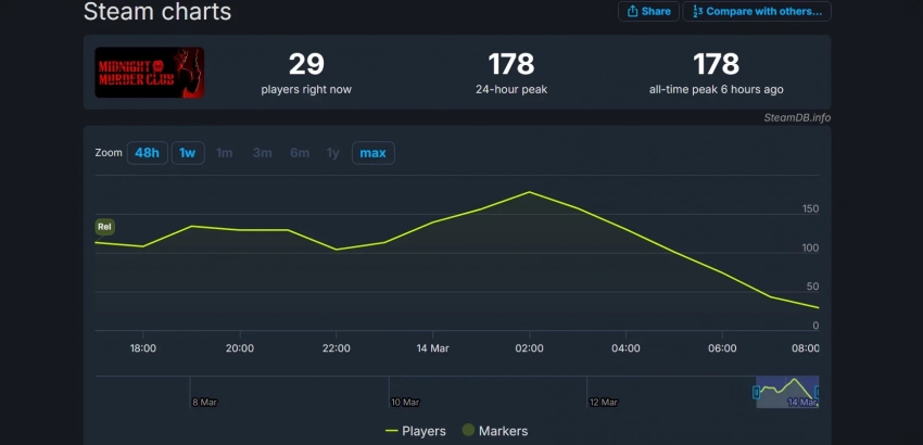 Что касается пикового онлайна, то в целом он соответствует нишевой новинке и составил 178 человек. Есть, правда, одна проблема — Midnight Murder Club установила антирекорд по пиковому онлайну Steam среди всех игр, изданных PlayStation Publishing.