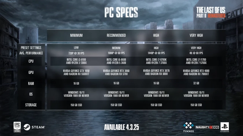 Главные новости » Эксклюзив » Ремастер The Last of Us: Part 2 займет 150 ГБ на PC и потребует GTX 1650 для игры на минималках