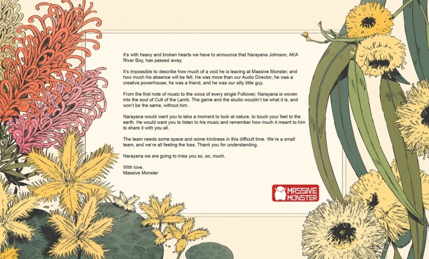 «Он был не просто нашим звукорежиссёром; он был творческой силой, другом и нашим маленьким глупым парнем. От первой музыкальной ноты до голоса каждого Последователя — Нараяна вплетён в душу Cult of the Lamb», — пишет студия.