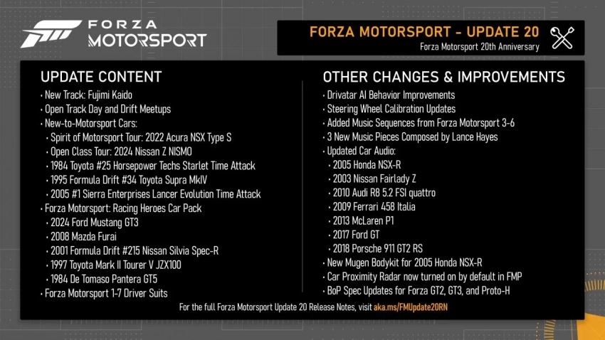 Частью нововведений стала легендарная трасса Fujimi Kaido, прибытие которой анонсировали около месяца назад. Эта трасса в японском стиле была доступна в самой первой игре серии, а теперь её полностью воссоздали с нуля, сохраняя оригинальную атмосферу. Её протяжённость — 16,5 км, и на пути игроки увидят разнообразные локации, от пышных лесов до вершины горы.