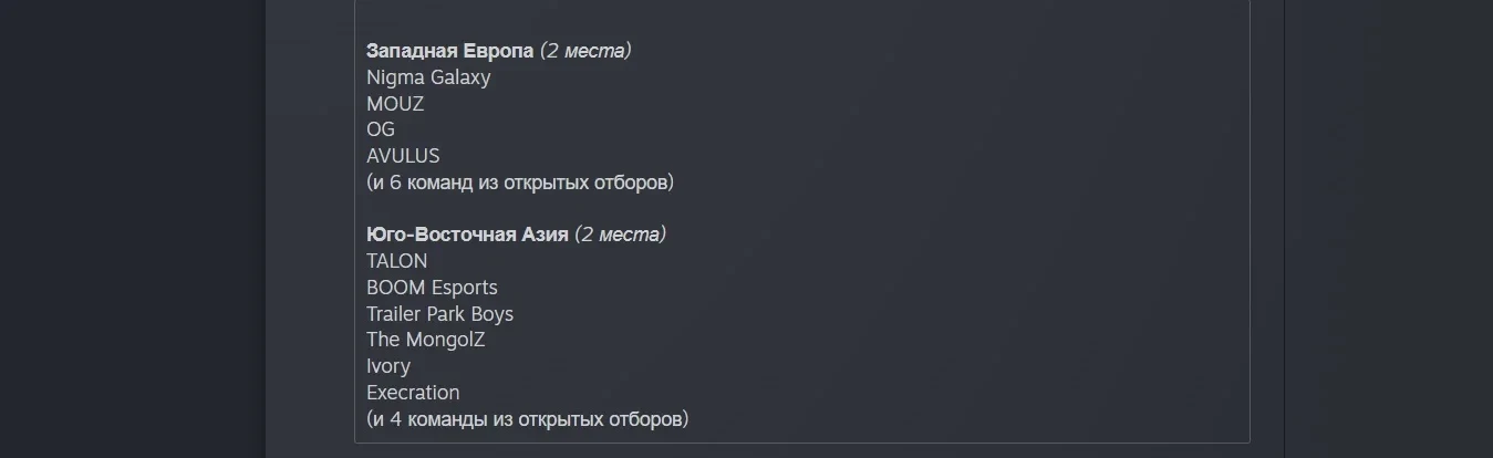 Бороться за оставшиеся восемь мест будет целое море команд, а значит, нас накроет волной интересных игр. «Дорога на The International» начнётся с открытых отборов, которые пройдут с 31 мая по 3 июня (исключение составит Китай, где они продлятся со 2 по 5 июня), а уже за ними последуют региональные. Участвовать смогут только игроки, состоящие на хорошем счету у соревновательного сообщества Доты.