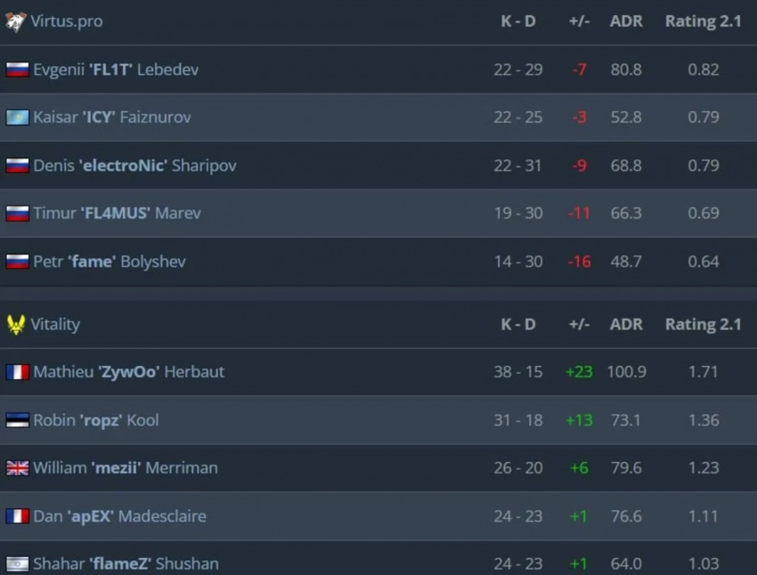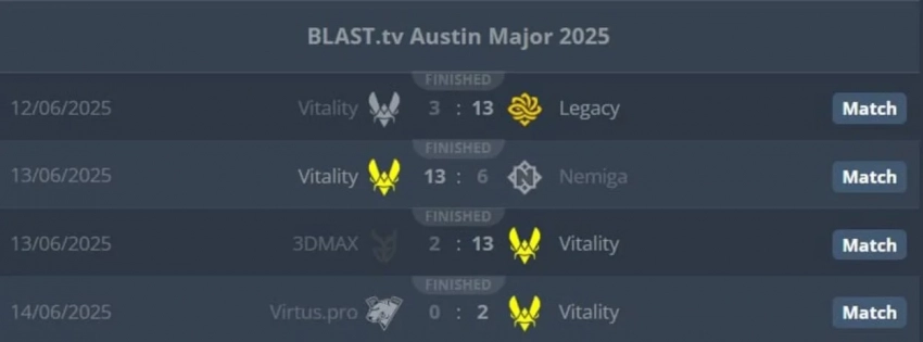 После неожиданного поражения от Legacy в первом раунде, Vitality уверенно держит позицию, проигрывая в среднем всего пять раундов за карту. Это даёт команде уверенность в борьбе за очередной трофей в этом сезоне.