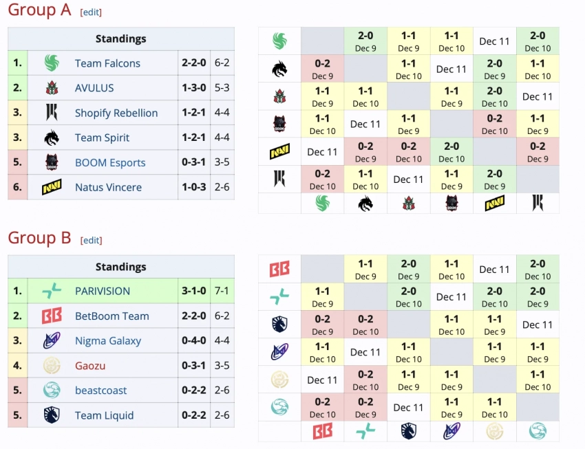 11 декабря пройдет последний день групповой стадии. BOOM сыграет с Spirit, AVULUS сразится с Shopify Rebellion, Natus Vincere поборется с Falcons. PARIVISION встретится с Nigma Galaxy, Gaozu посоперничает с BetBoom, а beastcoast определит сильнейшего с Liquid.