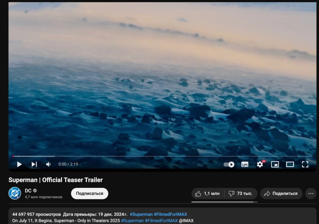 Первый ролик грядущей картины Ганна на данный момент собрал на YouTube-канале DC уже почти 45 млн просмотров (44,6 млн).