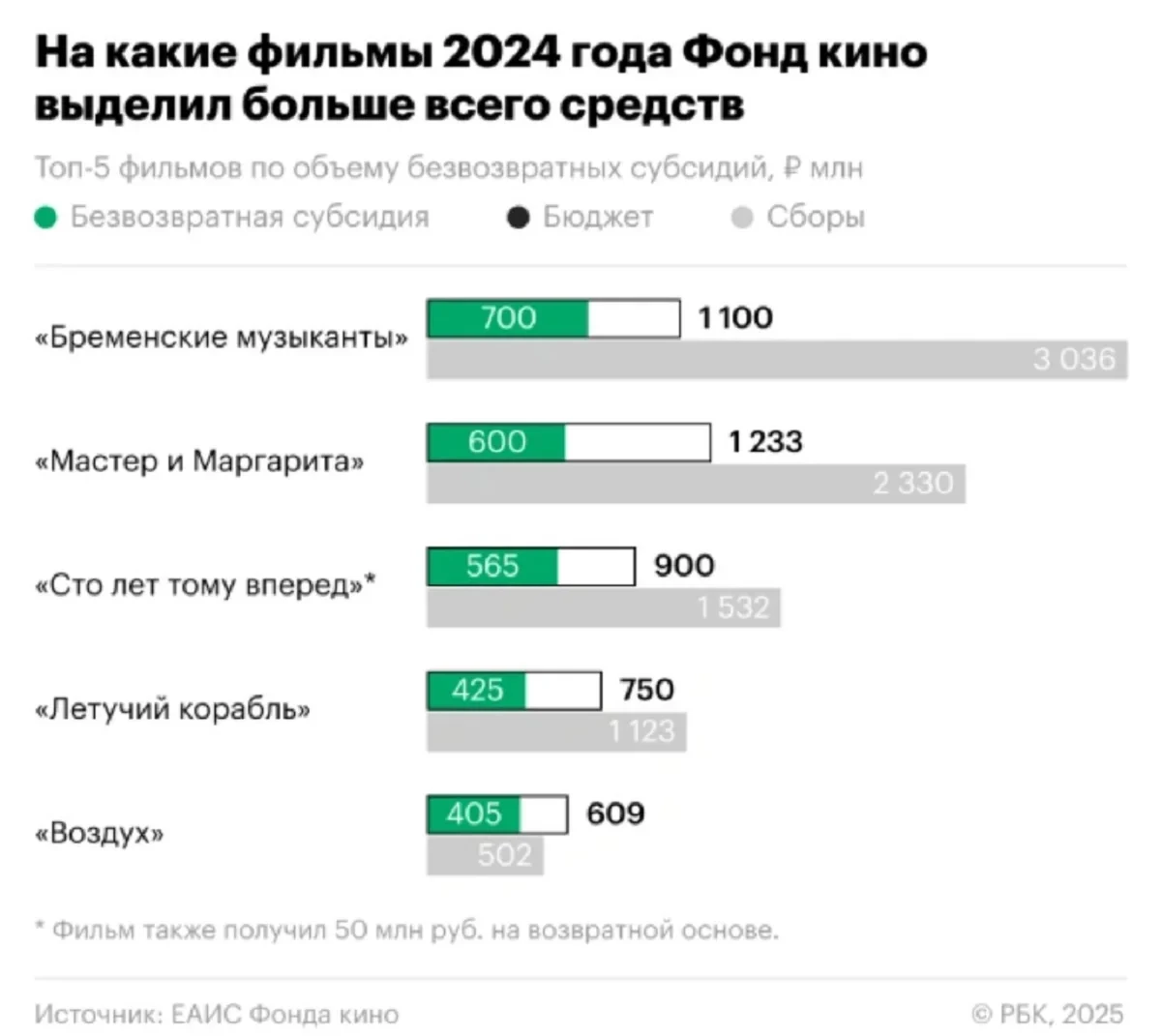 Чтобы считаться таковым, лента должна заработать в два раза больше, чем было потрачено на её создание — всё дело в проценте, который забирают кинотеатры с каждого билета. Наибольшую кассу с коммерческим успехом в 2024 году забрал «Холоп 2» — он заработал 3,8 млрд рублей при бюджете в 768 миллионов. Остальные молодчики Фонда кино выглядят следующим образом: