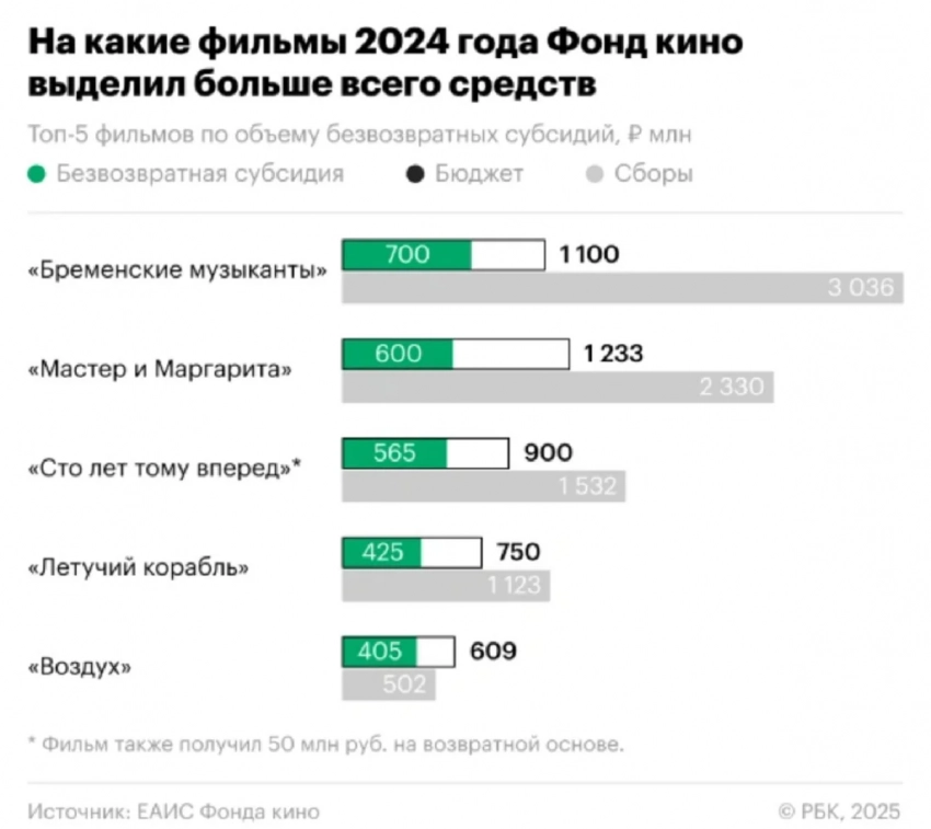 Самое интересное о кино на YouTube канале Игромании!Обложка: кадр из фильма «Бременские музыканты»В издании РБК проанализировали успехи российских фильмов в 2024 году, выпущенных при поддержке Фонда кино. Как оказалось, в этом году целая пятёрка таких лент (из 25-ти фильмов в целом) смогла окупить затраты на производство. Для сравнения, в 2022 году при поддержке фонда вышло 26 лет, из которых лишь одна достигла коммерческого успеха.