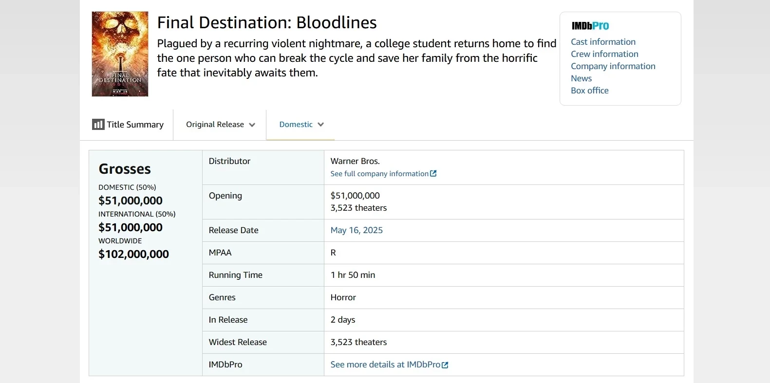 «Пункт назначения: Узы крови» — 51 млн долларов (102 млн долларов в мире);