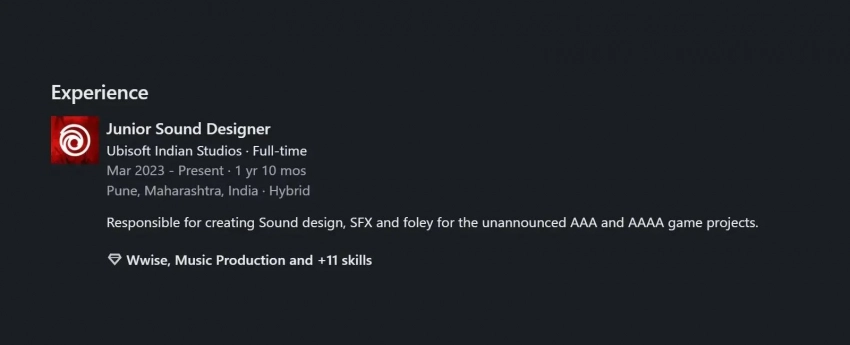 Как заявил в LinkedIn композитор и звукорежиссёр Karthikeyan S, сейчас в Ubisoft он отвечает за создание звукового дизайна, звуковых и шумовых эффектов неанонсированных игровых проектов — «AAA и AAAА».