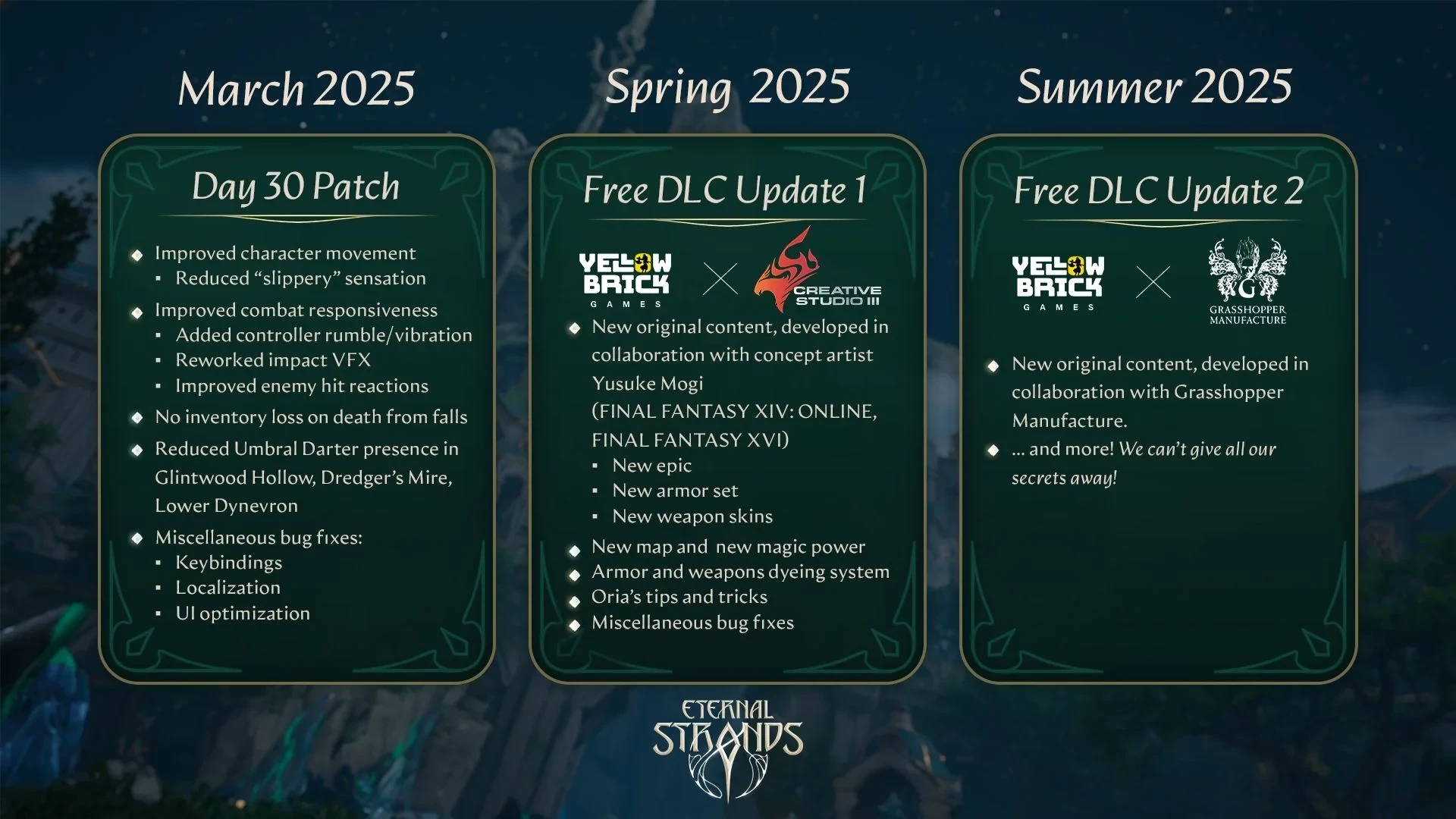 Исправлять ситуацию разработчики планируют всерьёз: в представленном плане развития игры фигурирует два бесплатных дополнения, а также рад улучшений. И этим игроки обязаны своей активности: авторы Eternal Strands поблагодарили всех за отзывы и идеи.
