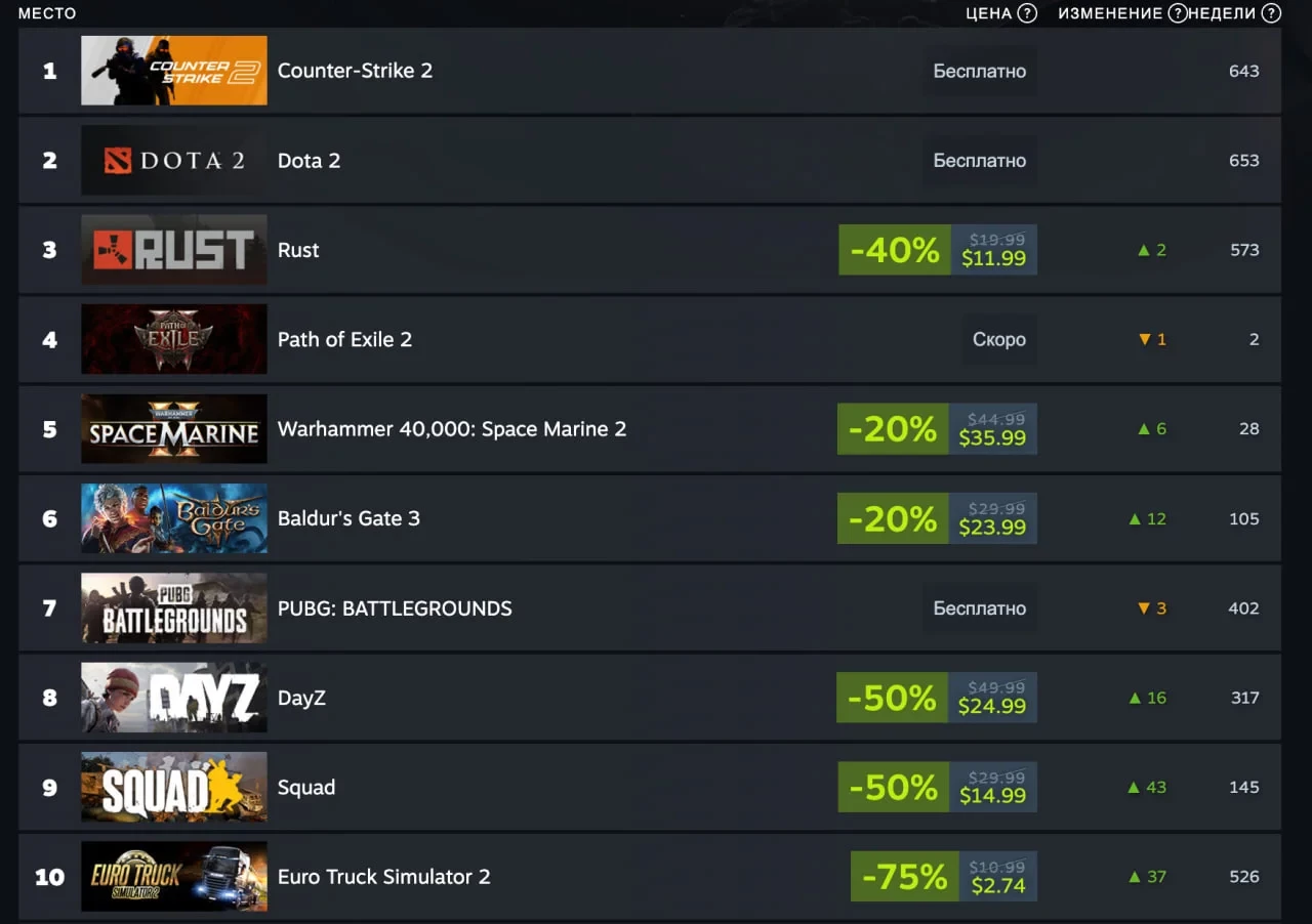 Скидка помогла BG3 занять 6 место (рост в 12 пунктов), кроме того в топе снова оказались DayZ, Squad и Euro Truck Simulator 2 — у них 8,9 и 10 места соответственно.