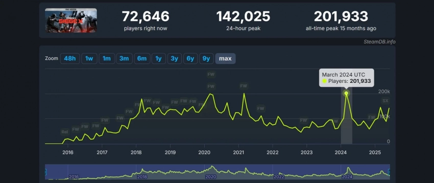Увы, переход на условно-бесплатную модель не помог Rainbow Six Siege X достигнуть новых вершин пикового онлайна в Steam — число игроков на пике за 24 часа лишь слегка превысило 142 тысячи. Для сравнения, бесплатные выходные в этом марте привлекли 145 тысяч геймеров на пике, а рекорд в почти 202 тысячи человек был поставлен в марте 2024 года.